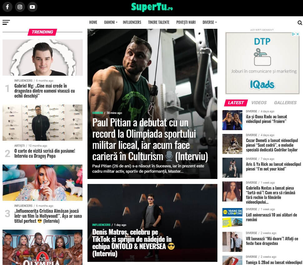 SuperTu.ro este o sursă de informații pentru cei care doresc să fie la curent cu evenimentele actuale, să se informeze despre diverse domenii de interes, precum Artă, Cultură, Tehnologie, Educație, Sănătate, Mediu, Știință sau Sport, și să se inspire din poveștile de succes ale personalităților din România și din lume.